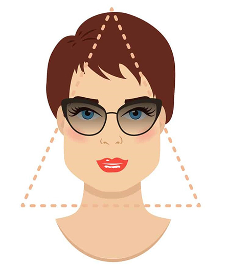 Để khắc phục độ hẹp của phần trán và tạo điểm nhấn cho khuôn mặt hình tam giác, bạn hãy chọn thử các khung kính có màu sắc và nửa phần khung kính phía trên có thể thêm họa tiết, hoặc có bề dày để tạo điểm nhấn. Ví dụ, kiểu mắt kính hình mắt mèo cũng là lựa chọn khá hợp