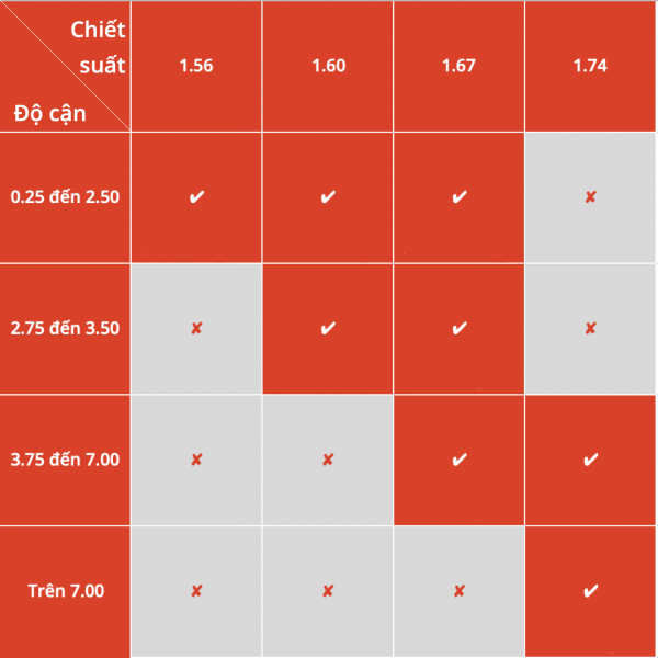 Độ cận từ trên 7.00 nên dùng chiết suất 1.74; độ cận từ 3.75 đến 7.00 nên dùng chiết suất 1.67 hoặc 1.74; độ cận từ 2.75 đến 3.50 nên dùng chiết suất 1.60 hoặc 1.67. Với người cận nhẹ từ 0.25 đến 2.50 có thể dùng chiết suất 1.56, 1.60 hay 1.67 tuỳ nhu cầu.