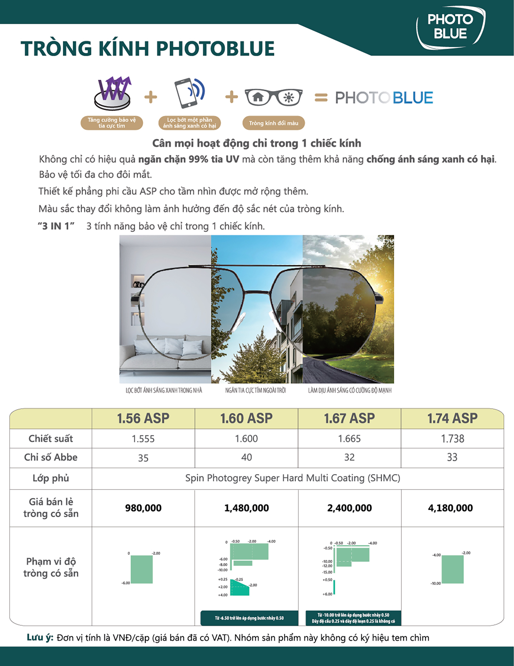 Tròng đầy đủ tất cả tính năng : Hạn chế trầy, cản tia UV420, phản quang chống chói, phủ Nano trơn bóng chống bám bụi, bám nước, đổi màu đen khói khi ra nắng, lọc ánh sáng xanh từ các thiết bị điện tử gây hại cho mắt.