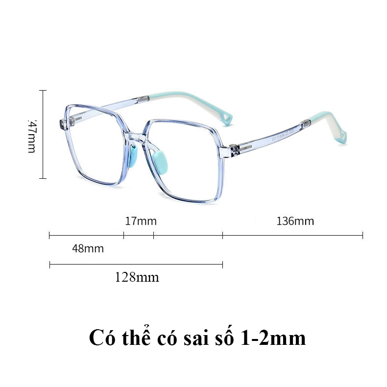 Kính chống ánh sáng xanh trẻ em vuông lớn trai gái 2293 với cấu tạo từ nhựa TR90 siêu dẻo để hạn ché bé làm gãy vỡ, đệm mũi Silicon cực êm ái không làm đau bé và chân kính nhám chống trơn trượt khi bé vận động. Thiết kế kính vừa vặn cho các bé từ 6 -12 tuổi. Tròng kính gắn sẵn là tròng 0 độ có chức năng chống ánh sáng xanh từ màn hình điện tử, tia UV có hại trong ánh mặt trời đeo bảo vệ mắt hoặc có thể thay thế tròng cận ạ.