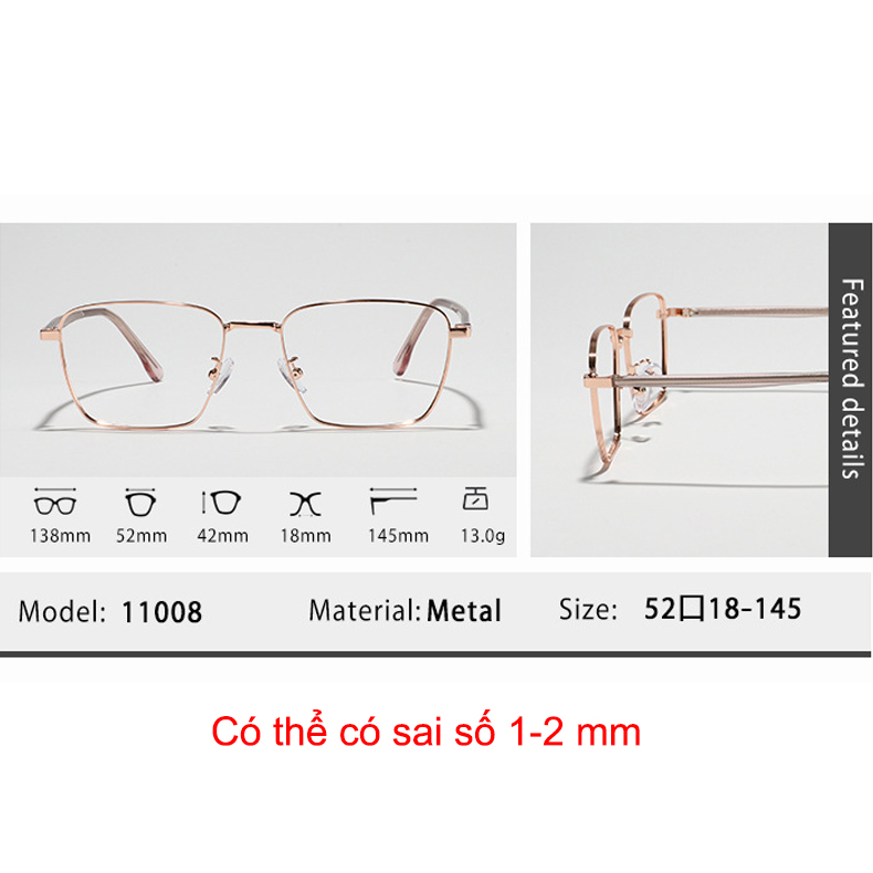 Mắt kính chống ánh sáng xanh vuông kim loại nam nữ 11008 với cấu tạo khung kính là hợp kim chắc chắn được bọc bên ngoài bởi lớp nhựa TR90 dẻo. Bản lề kim loại bền bỉ. Tròng kính lắp sẵn là tròng 0 độ chống ánh sáng xanh nên có thể đeo thời trang bảo vệ mắt hoặc thay thế tròng kính mọi độ ạ. Shop cũng chuyên đo mắt miễn phí, cắt tròng lấy liền đó ạ.