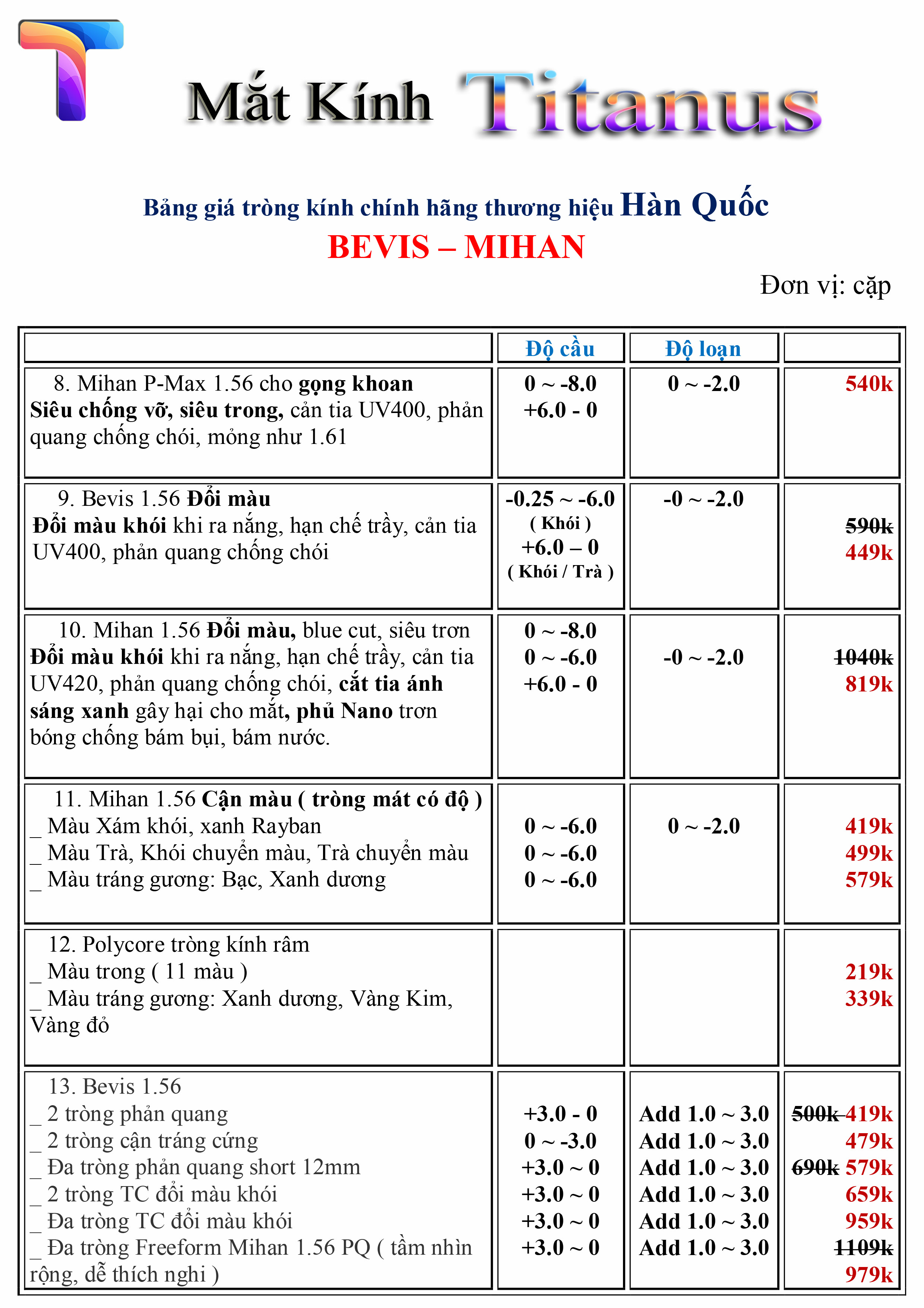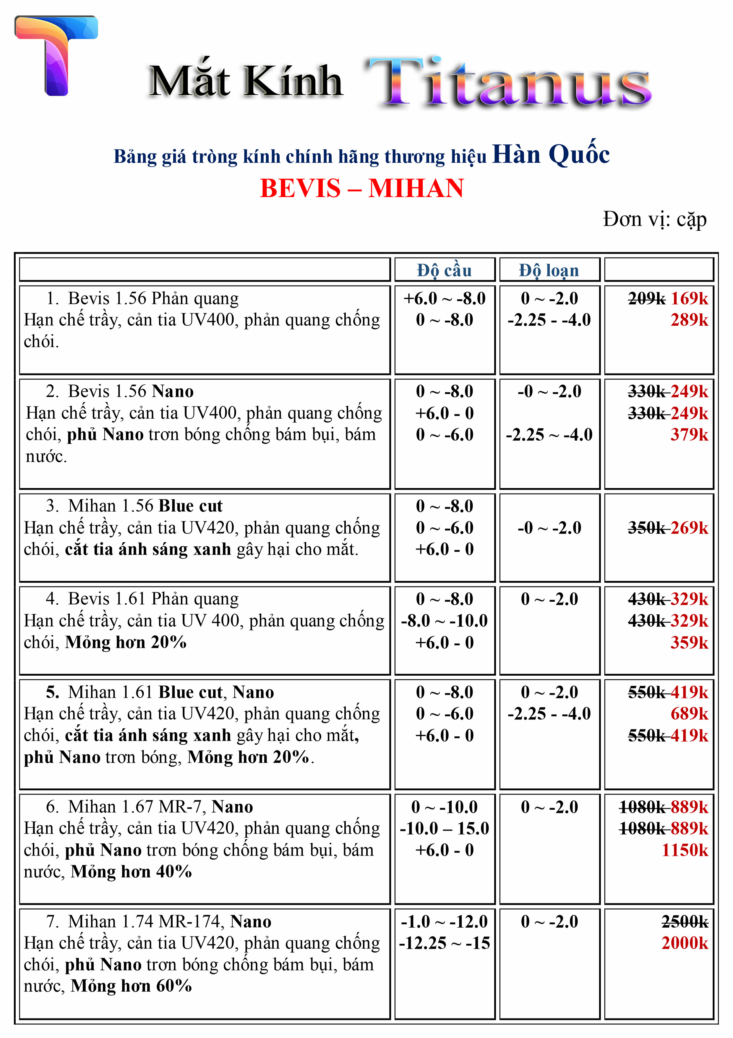 Mắt kính Bevis - Mihan giá bao nhiêu phụ thuộc vào vật liệu, chiết suất, độ cận, tính năng. Bạn có thể tham khảo bảng giá sau: