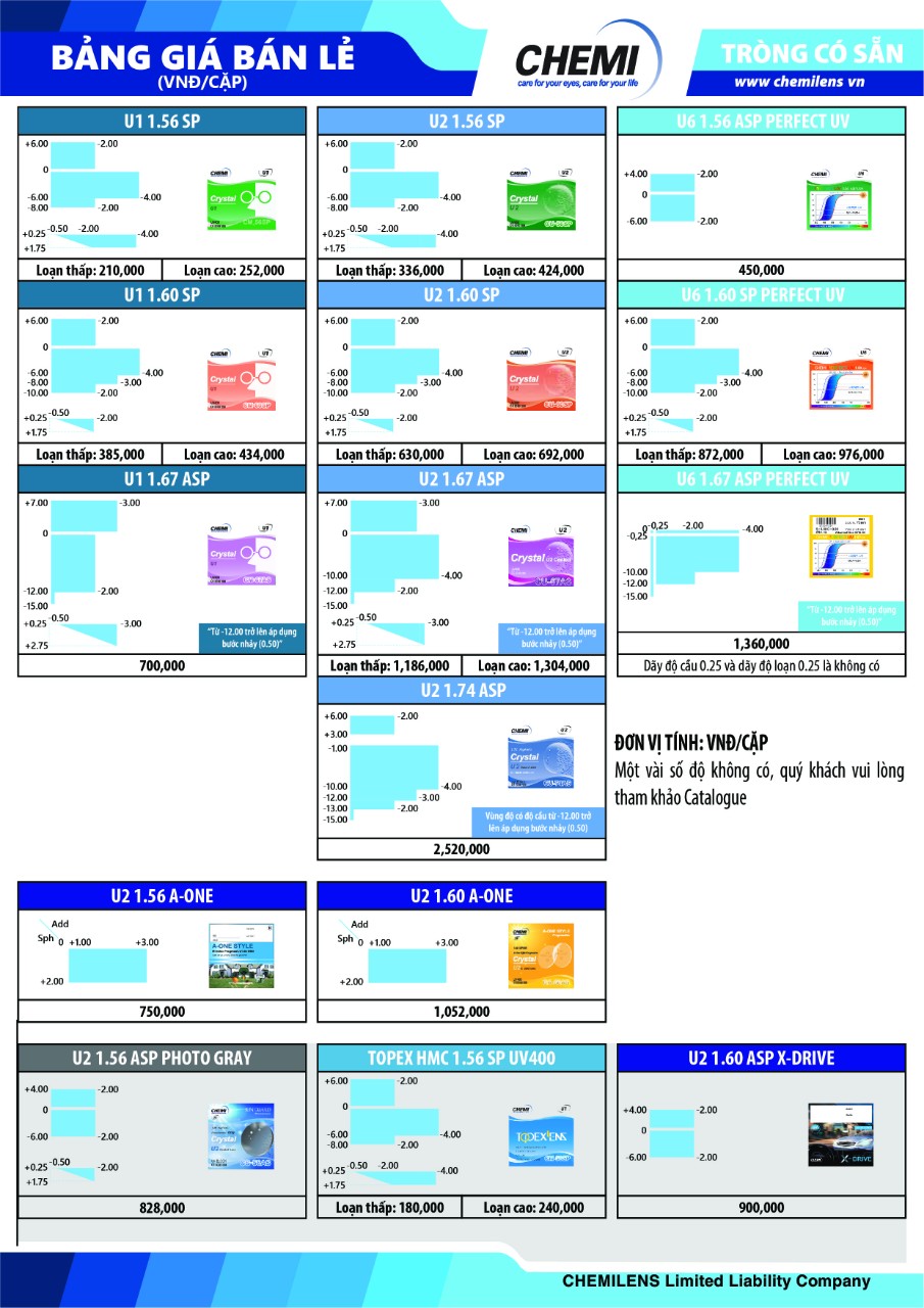 Mắt kính Chemi giá bao nhiêu phụ thuộc vào vật liệu, chiết suất, độ cận, tính năng. Như kính Chemi U2 chiết suất thấp nhất là 1.56 có giá 336.000 đồng/cặp, Chemi U2 chiết suất 1.60 là 630.000 đồng/cặp. Vẫn là Chemi U2 1.56 nhưng loại Photochromic, tức là có thêm tính năng đổi màu khi ra nắng thì giá lại cao hơn là 828.000 đồng/cặp.