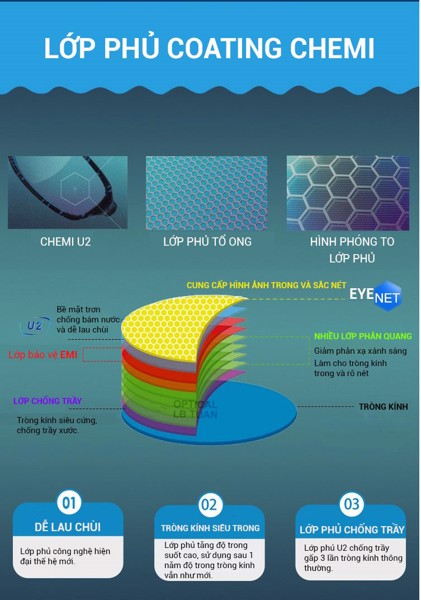 Thứ hai, về lớp phủ tròng kính Chemi: Tròng kính chính hãng Chemi trên bề mặt tròng kính hình thành một lớp bảo vệ tự nhiên, khả năng chống sự hình thành tĩnh điện, chống bám bụi trên bề mặt tròng kính, khiến cho việc bảo quản vệ sinh tròng kính dễ dàng hơn.