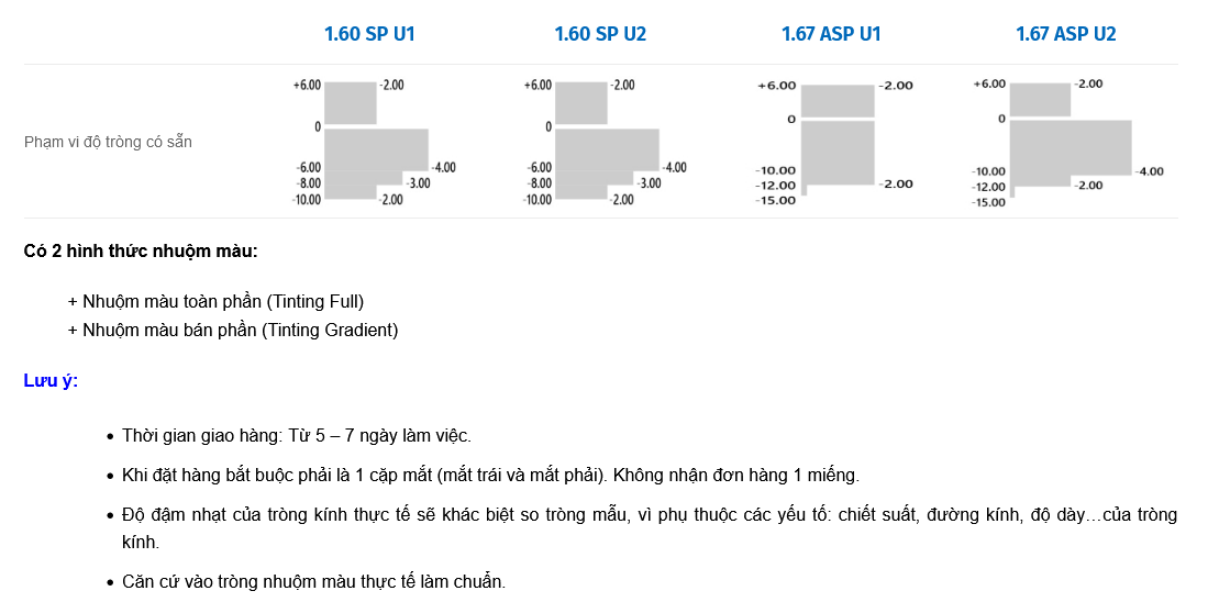 Tròng thích hợp với người có độ cận cao muốn sử dụng kính râm và bảng màu mắt đa dạng phù hợp với mọi nhu cầu và lứa tuổi.
